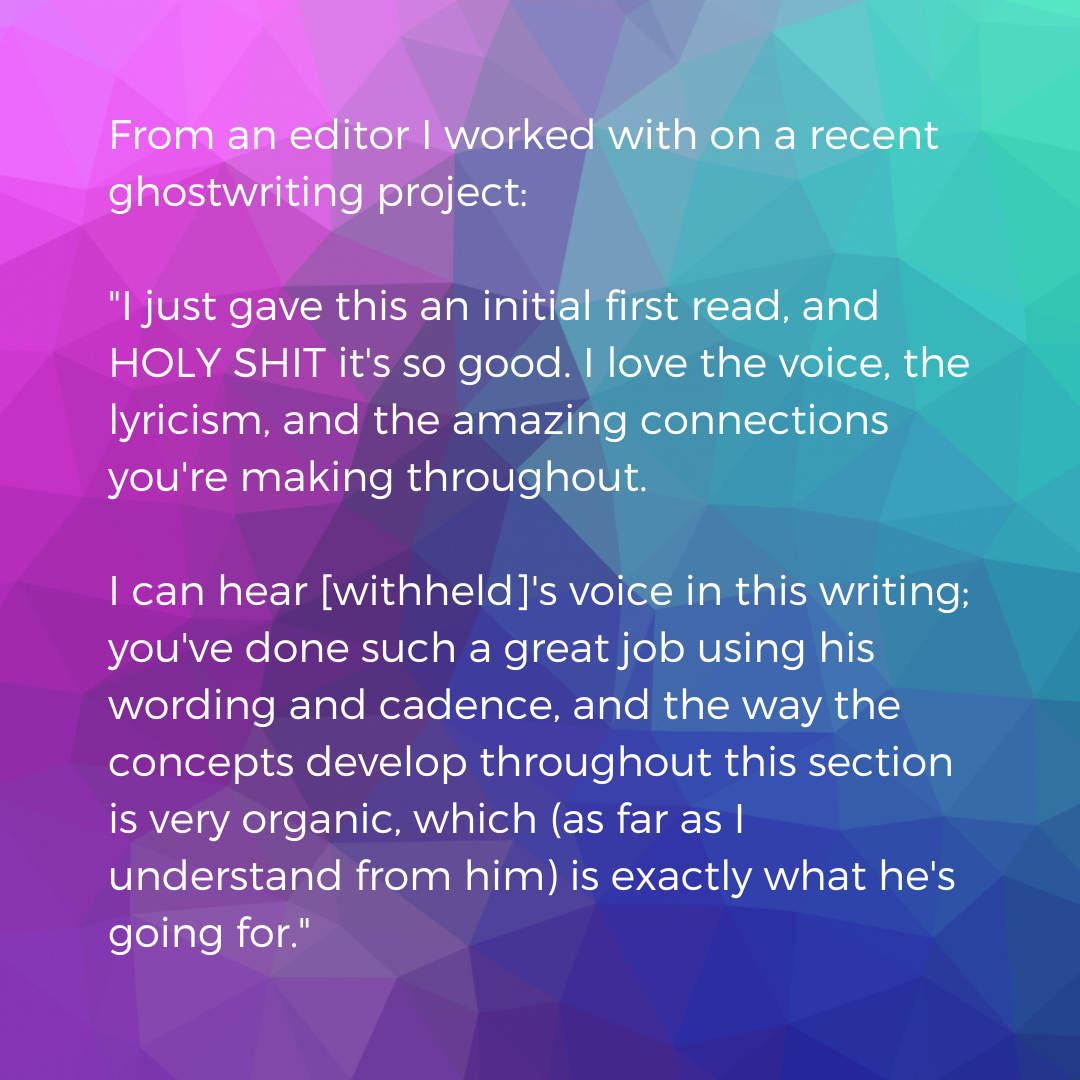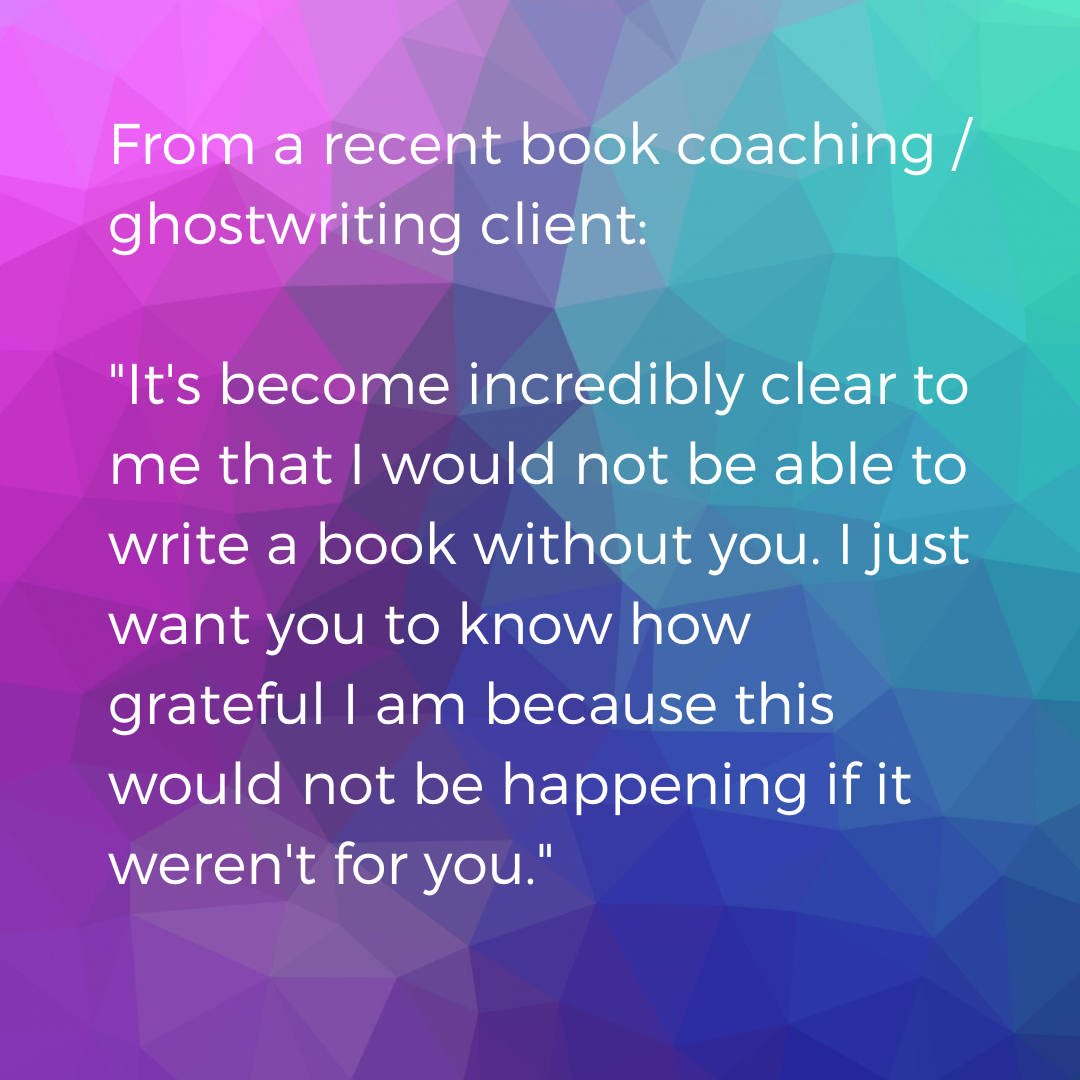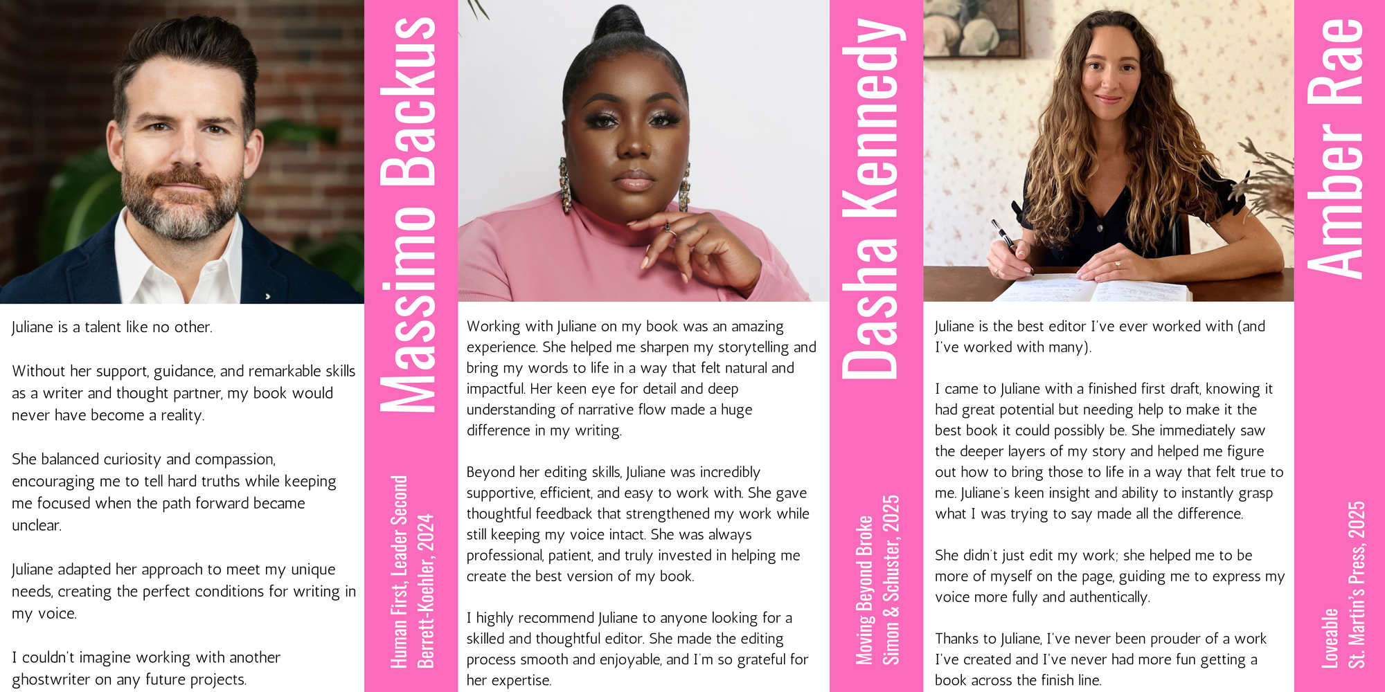 All the recommendations on this page are direct quotes and testimonials from clients, although some are anonymous, because I often work under an NDA. The books I've contributed to have been published through the big five, trade publishers, small presses, and hybrid publishers, including Simon & Schuster, Hay House / a division of Penguin Random House, St. Martin's Press / a division of Macmillan, Berrett-Koehler, and Lioncrest.